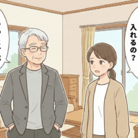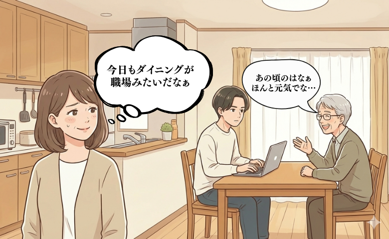 パパが休みの日、ダイニングテーブルで仕事をしているパパに、じいじの猛烈トーク。