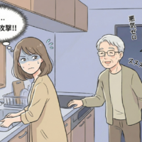 パパが休みの日、ダイニングテーブルで仕事をしているパパに、じいじの猛烈トーク。