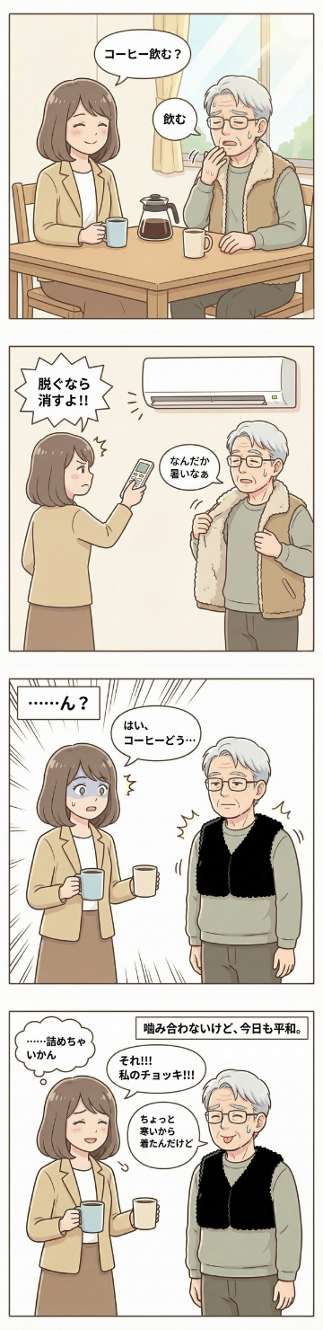 でもさ、ジイジが暑いって言ったからエアコン切ったのよ!?なのに何でチョッキ着たん?寒いの?